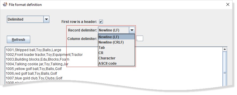 • Each row of data is considered to be delimited by the Record delimiter. The options are the same as for the Column delimiter.