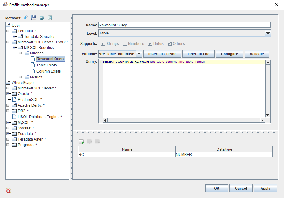 The Rowcount metric is not actually used as a profiling metric—it enables you to customize how 3D performs a row count on each table at the start of the profiling process. You can create your own metric to do this but it MUST be named Rowcount.