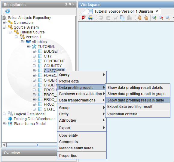 To view the profiling results for a particular table via the Metric result table, right-click on an entity in the repository tree and select Data profiling result>Show data profiling result in table.