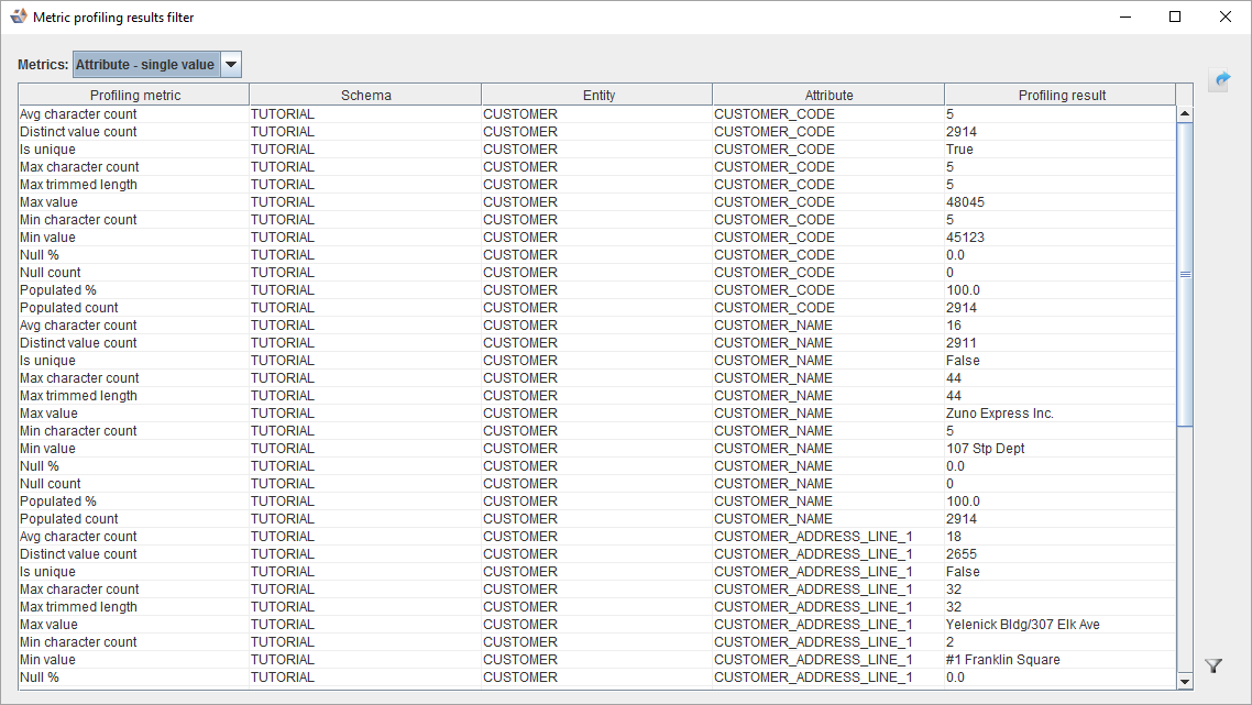 To view the Metric result table from the diagram, right-click on an entity in the diagram and choose Profiling result, then Show data profiling result in table.
