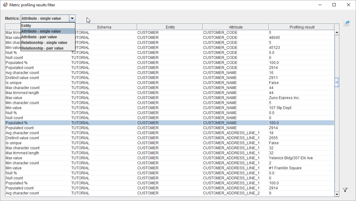 To change the metrics currently being displayed (Entity, Attribute - single value, Attribute - pair value, Relationship - single value or Relationship - pair value level metrics) choose an option from the Metrics combo box: