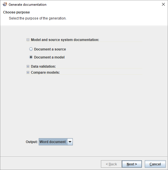 2. From the Generate documentation dialog, select the Document a model or Document a source radio button as the purpose of the generation.