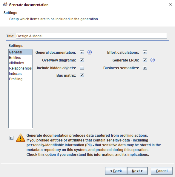 3. Enter the title and select the items to be included in the documentation generation. Click Next to continue.