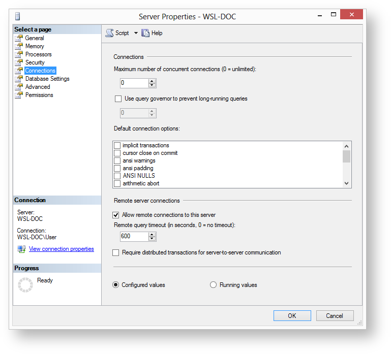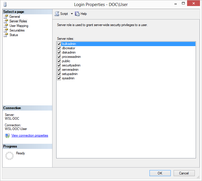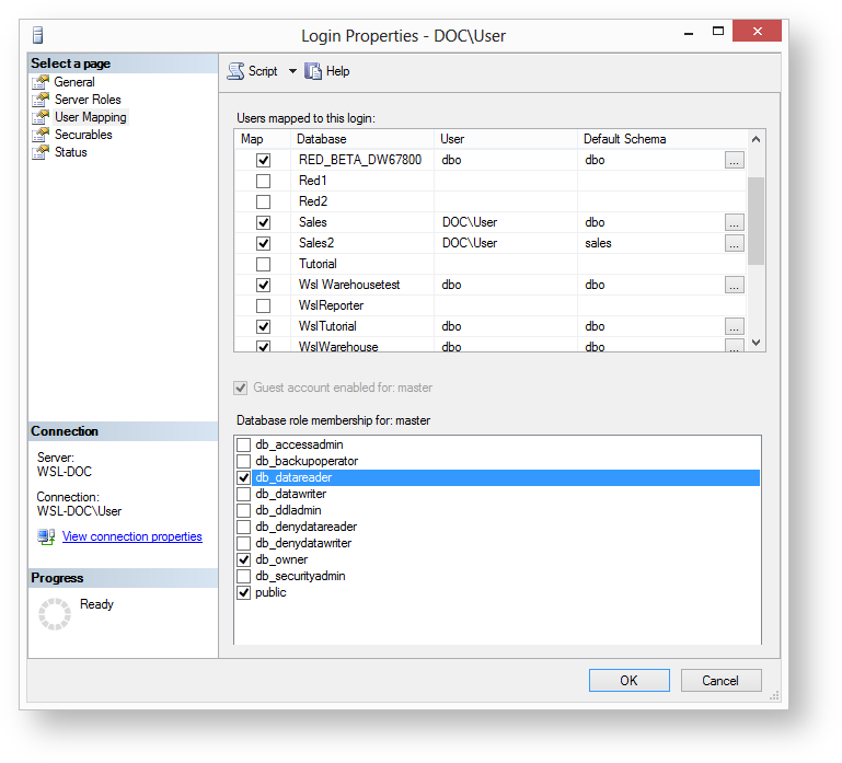 The minimum required server roles are: public. - Confirm that the User Mapping settings are appropriate