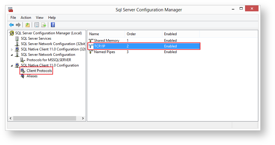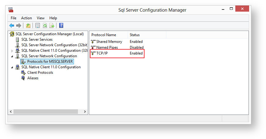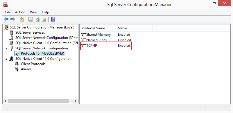 - Open SQL Server Configuration Manager and confirm that for MSSQLSERVER, TCP/IP is enabled.