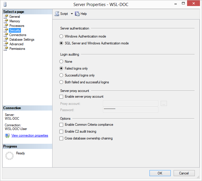 - Ensure that the Server authentication allows both SQL Server and Windows Authentication.