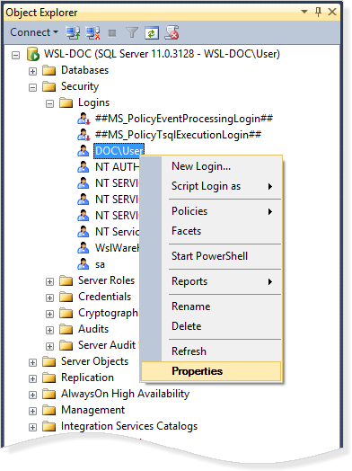 - We need to check that the database user has the right permissions. Right-click on the database user and choose Properties.
