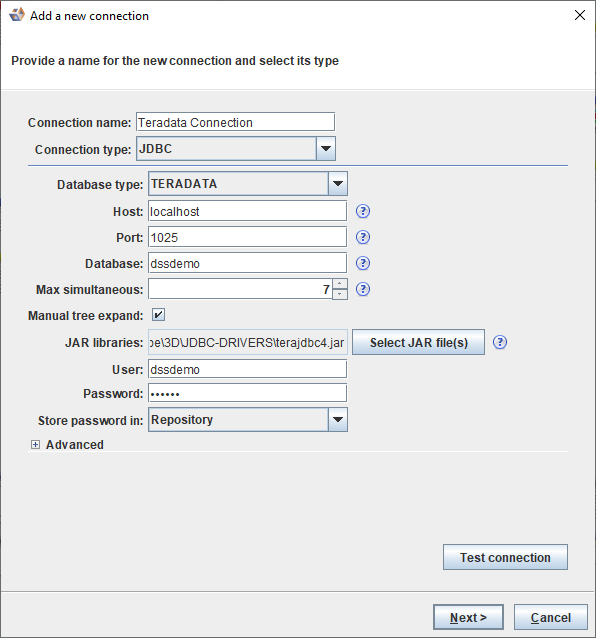 JAR libraries | Select the Teradata jar file from the JDBC-DRIVERS directory. |
