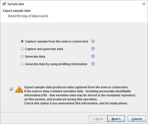 The following dialog gives four options for exporting sample data. Make your selection and click Next.