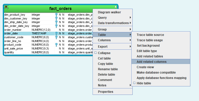 1. Right-click on fact_orders in the diagram and select Table>Add related columns.