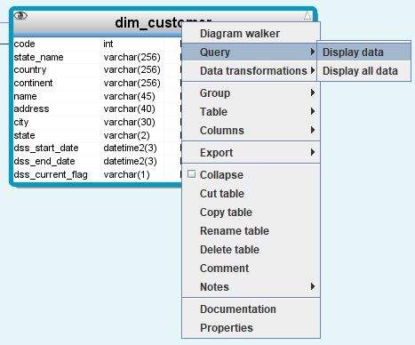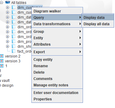 - To display the data on an entity right-click on the table in the tree, or header part of the table in the diagram, and choose Query then Display data or Display all data.