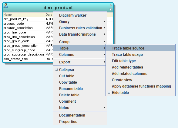 To trace the source of an entity, right-click on the entity and select Table>Trace table source: