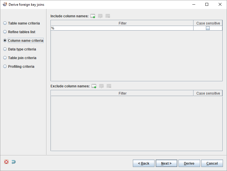 7. The final criteria dialog allows profiling results to be used to limit table joins. For example, joins to a table could be excluded for empty tables based on profiling results. Specify profiling criteria and click Derive to continue.