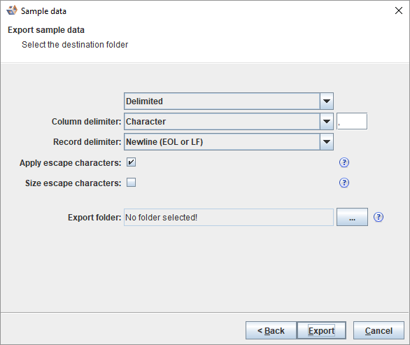 3. The Export sample data - Select the destination folder dialog allows you to set the column and record delimiters and to select the destination folder.