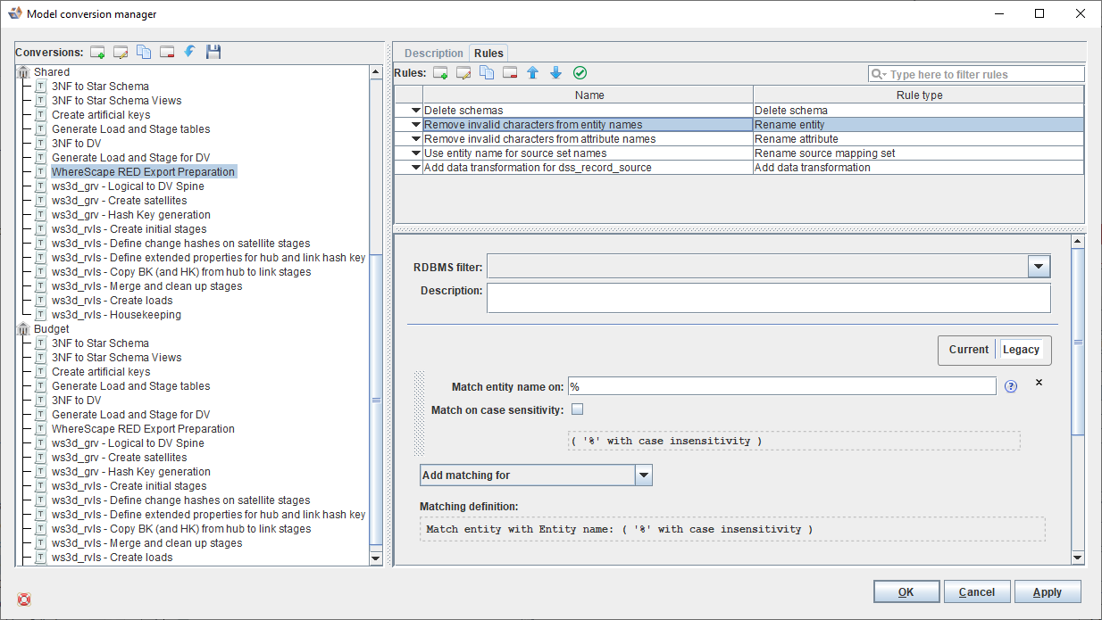 If the rule should only be applied for specific RDBMS, select them in the RDBMS Filter drop-down menu. If nothing is selected, the rule is always applied when the model conversion is run.