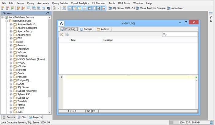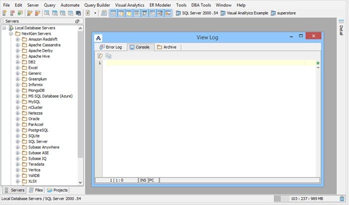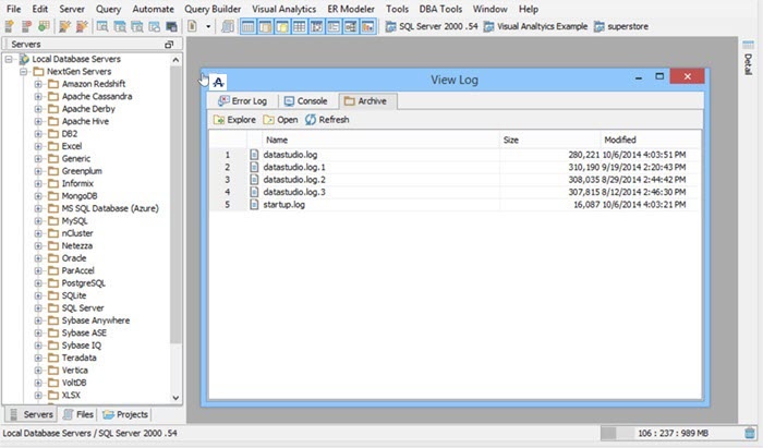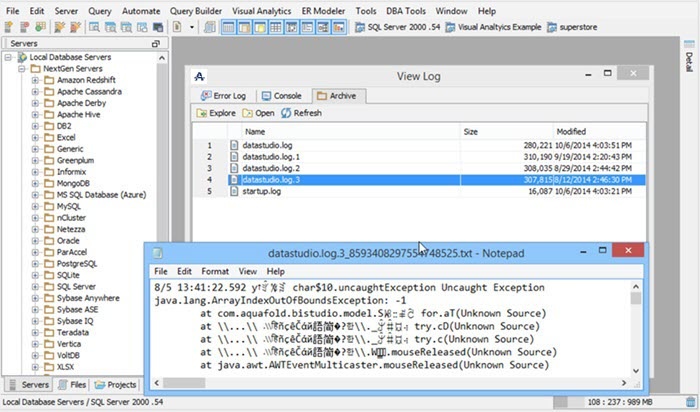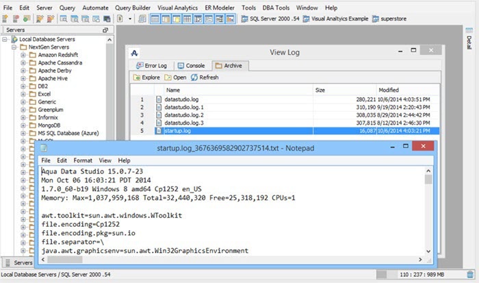 The View Log window provides three tabs for examining logs, errors, and actions taken by Aqua Data Studio. This is useful for troubleshooting issues and support questions, and monitoring server connection status. The Logs and Support information can be found under the main application menu item Help.