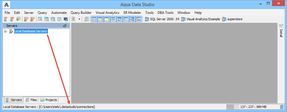 If you have suddenly lost all of your registered servers, it's possible that an environment variable for your USERPROFILE changed recently. To check where Aqua Data Studio is looking for your connection files, click on the Schema Browser tree node "Local Database Servers" at the very top of the Schema Browser. At the bottom left of the Main Application window, the status bar will indicate the path Aqua Data Studio is currently using for its connection files.