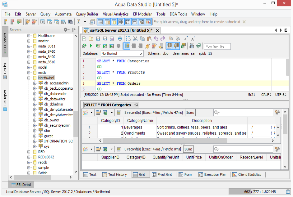 The Script Detail Results lists each statement executed in a script with detail indicating success, failure, and/or warnings. Double-clicking on an item highlights the associated lines in the script.