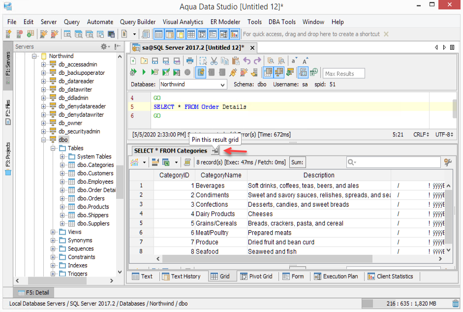 A Grid Result can be pinned so that if a query is re-executed the pinned results do not get cleared. Clicking the horizontal pin icon in the Query Analyzer Grid Results toolbar tab (a vertical pin appears) pins the result. Pinned Results get their own tab within their Result Pane. Pinned and unpinned results tabs can be navigated just like Query Analyzer tabs with right-click context menus or the tab navigator to the right side of the pinned and unpinned tabs. The orientation of the pin icon helps distinguish which Results Pane tabs are pinned (vertical pin) and which are not pinned (horizontal pin).