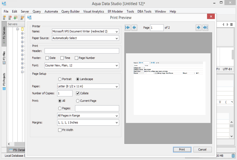 Grid, Text, and Execution Plan results can be printed using a physical or software printer. The printing can be configured using options presented in the Print dialog such as: document header and footer, paper size, margins, and document orientation. The Print Preview displays the layout of the item selected for printing. Once printing begins, Aqua Data Studio provides a popup status dialog that both shows what page is currently printing and provides the ability to cancel the print job.