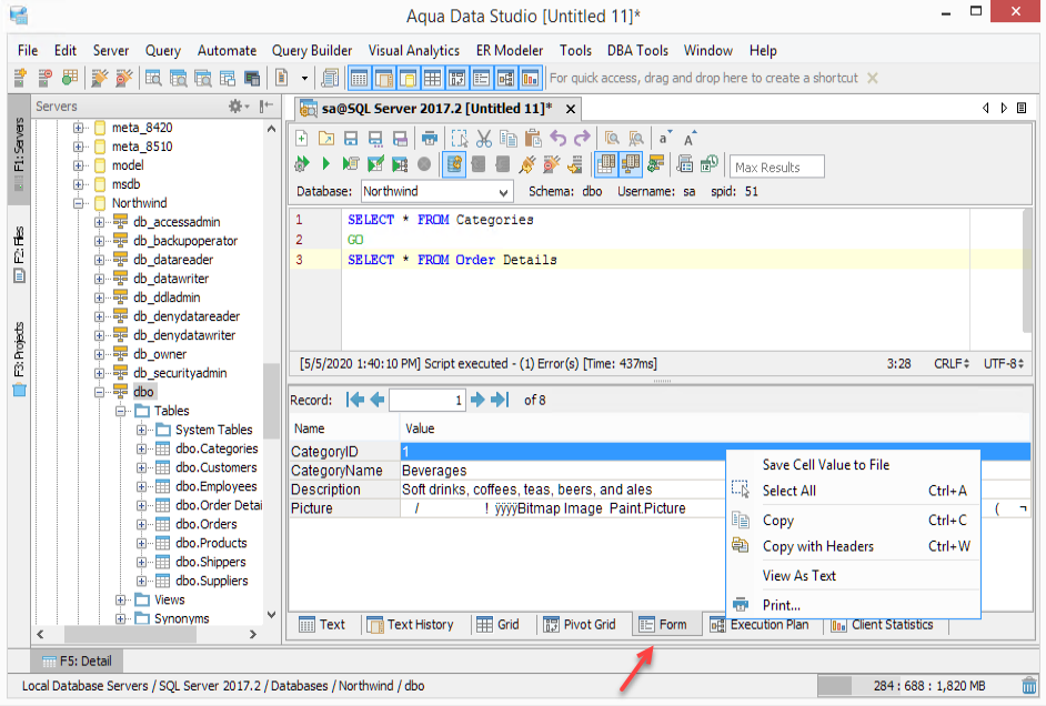 Client Statistics displays detailed statistics on the execution of the statement or script.