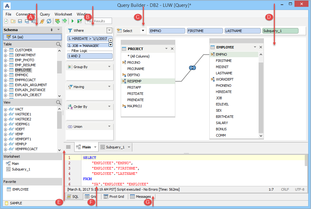 Main, Subquery,         SQL Pane                        Results Tabs