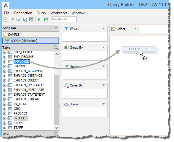 5. Drag-and-drop EMPNO, FIRSTNME, and LASTNAME into the Select Deck.