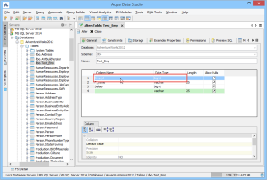 Within the General tab, the table name, column names, datatypes and allow nulls can be changed. The Column information is sortable, expandable, and displays more details about the selected columns. INSERT and DELETE of columns is available via right-click on the Column Names within the General tab of CREATE and ALTER dialogs. The database and schema cannot be changed, and remain grayed out. Columns can be added (INSERT), deleted (DELETE), and changed (ALTER).