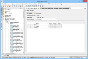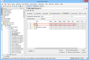 Table Permissions (when privileges to do so have been granted to the current user in the server registration Permissions tab) can be altered and granted on the Permissions tab for column and command. Full grant options are available and all Permissions can be set by Grantee Type for Users, Groups, or Roles depending on database vendor and type. Grant, Grant with Grant Option, Add Grant, Add Grant with Grant Option, and Revoke are available for SELECT, INSERT, UPDATE, DELETE across all databases. Depending on vendor supported functionality, there are other permissions that may be set such as ALTER, INDEX, References, On Commit Refresh, Query ReWrite The "Columns..." button at the bottom right of the Permissions tab, allows further permissions changes, including SELECT, INSERT, UPDATE, and References for the columns highlighted in the permissions grid within the Permissions tab.