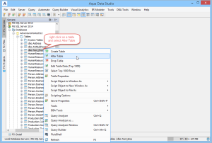 Altering tables through the GUI is also done with a right-click menu on table objects in the schema browser. Right-clicking on a table object opens the same popup menu as above, but to ALTER a table, select the second item in the list, "Alter Table".