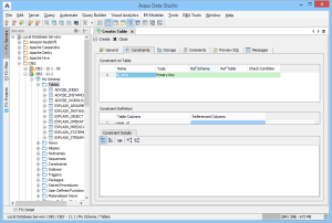 The Constraints tab allows the selection of columns for use in constraint creation (including Primary Key) and checks conditions. Constraint properties details such as Name, Type, Ref Schema, Ref Table, and Check Condition are modifiable visually. Constraint Definition Table Columns and Referenced Columns can be visually edited. For more on constraints, see the Creating Constraints page.