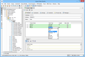 The Create Table dialog has General, Constraints, Storage, and Preview SQL tabs across the top. The General tab is where the table is named and its columns and datatypes are set. The Column information displays more details about the selected columns in the description area below the column grid. INSERT and DELETE of columns is available via right-click on the Column Names within the General tab of CREATE and ALTER dialogs. All of the datatypes available to the current database can be accessed with a dropdown next to the column names.