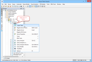 Creating tables through the GUI Tools available in the schema browser begins with opening a database server connection and expanding the tree to view the server's tables. Right-clicking on the schema container for Tables generates the pop-up menu containing "Create Table" as its first item.