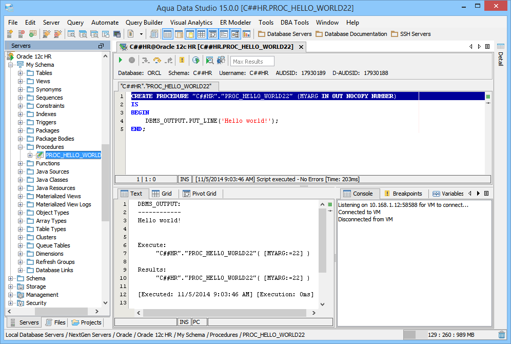 - Running the function or procedure up to next breakpoint. The execution can be stopped at any time using the stop button. Output messages for the execution can be viewed in the Console tab.
