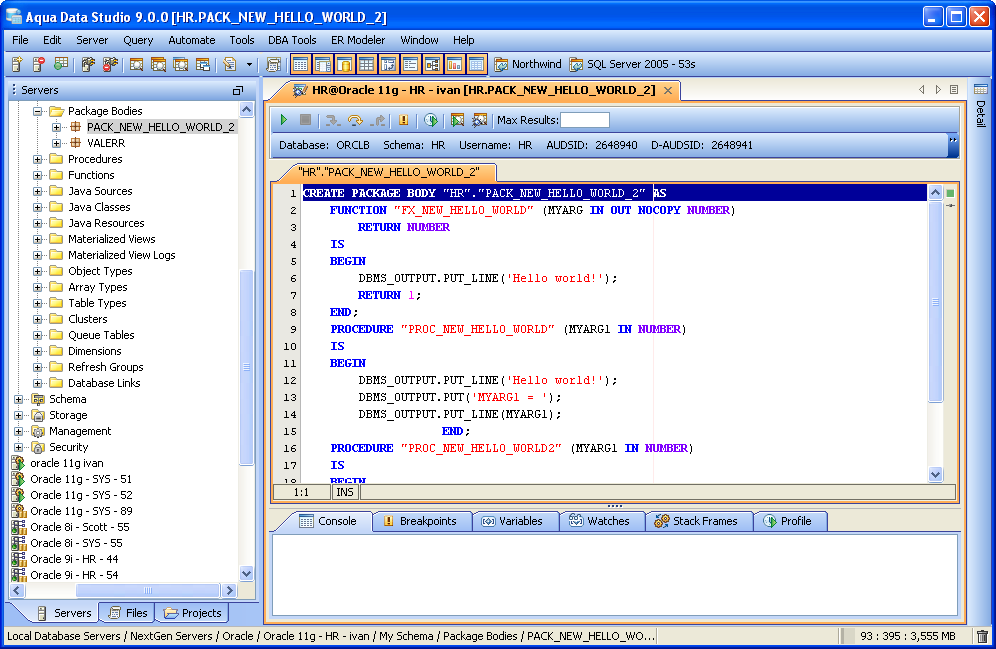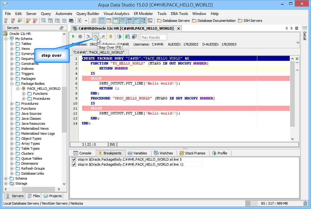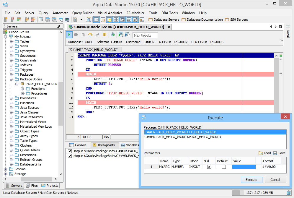 - Setting breakpoints in the function or procedure body. A user can set a breakpoint at any line in the function or procedure source code in order to run it up to this line. The breakpoints can be viewed in the Breakpoints tab.