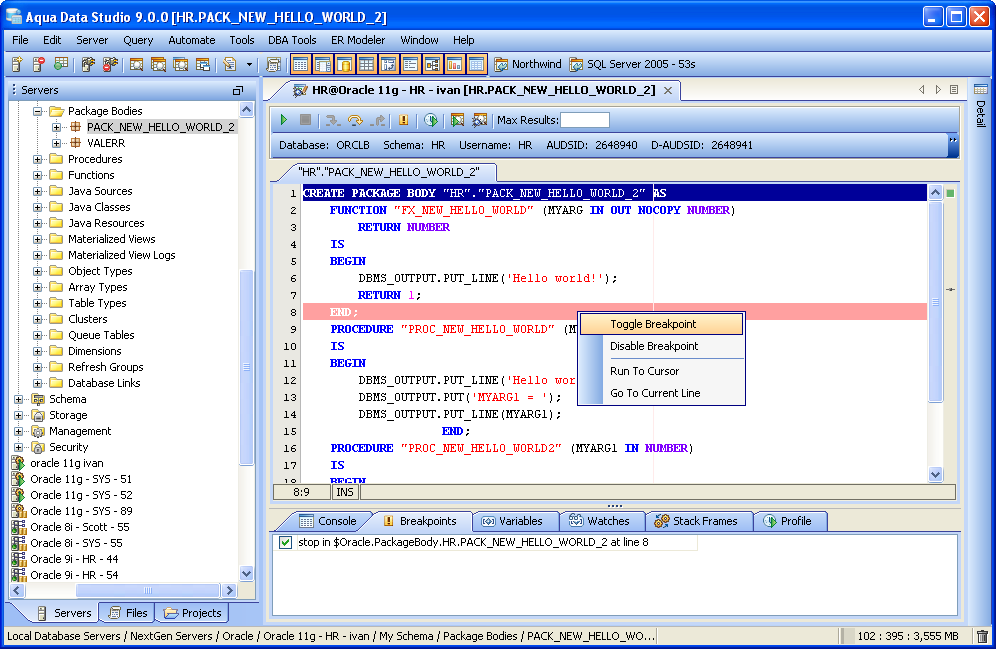 The procedure or package displays in the debugging window, within which breakpoints can be added by right-clicking and selecting "Toggle Breakpoint" from the popup menu. When this window has focus, and a line has been clicked, it is also possible to select "Run to Cursor," to run the debugger up to that line in the procedure. From the same popup menu, "Go to Current Line" brings the cursor to the current line, which is very useful when debugging multiple lengthy procedures.