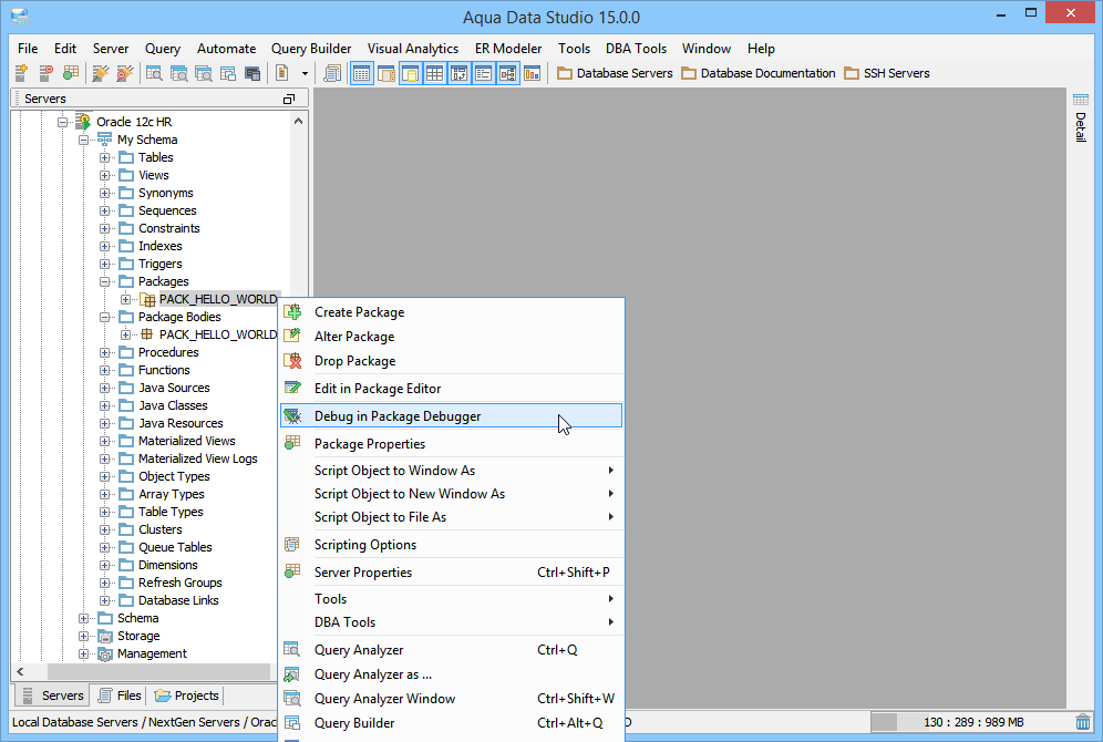 The Oracle SQL Debugger is launched through a right-click in the Schema Browser on Stored Procedures or User Defined Functions and selecting Debug from the popup menu. More than one debugger can be open at once, with each object to be debugged opened in a separate tab.