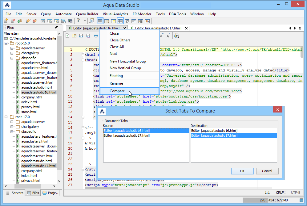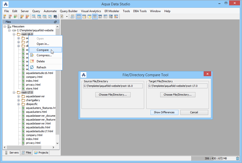 Aqua Data Studio provides six compare tools to easily compare database schemas, schema objects, queries, query results, files, directories, clipboard contents, and version control history.