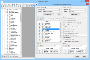 Aqua Data Studio provides various comparison filters and options. When files, queries, or tabs are compared, the comparison functions down to the character level within each. When schemas are compared, the level of comparison granularity can be set by the user for database schema object types as desired.  For even more control over the comparison, you can apply filters to the comparison result. The results of all comparisons can be saved as HTML for storage or sharing.