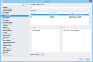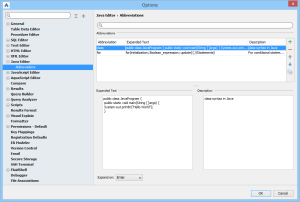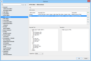 |  SQL Editor Options SQL Editor Options - General - Autocompletion SQL Editor Options - Syntax Coloring - Tabs SQL Editor Abbreviation Options |
