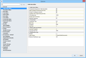 Transactions Required for Table Data Editor: Determines whether the Table Data Editor requires transactions. NOTE: If this is set to false, the Table Data Editor can’t guarantee single row modifications for row updates. Paste Transforms (null) String into NULL: Allows insertion of a NULL value when pasting a (null) string from the clipboard Prompt for Ambiguous Columns: If this value is true, the user will be prompted to identify the ambiguous columns, otherwise those columns will be read-only. Transform Zero Length String into NULL: Determines whether a zero-length string is replaced with NULL TOP default size: TOP size selection when selecting Table Date Editor in schema browser. Prompt user for TOP size: Prompt user for TOP size when selecting Table Data Editor in schema browser. Statement separator: Statement separator to use when generating DML scripts