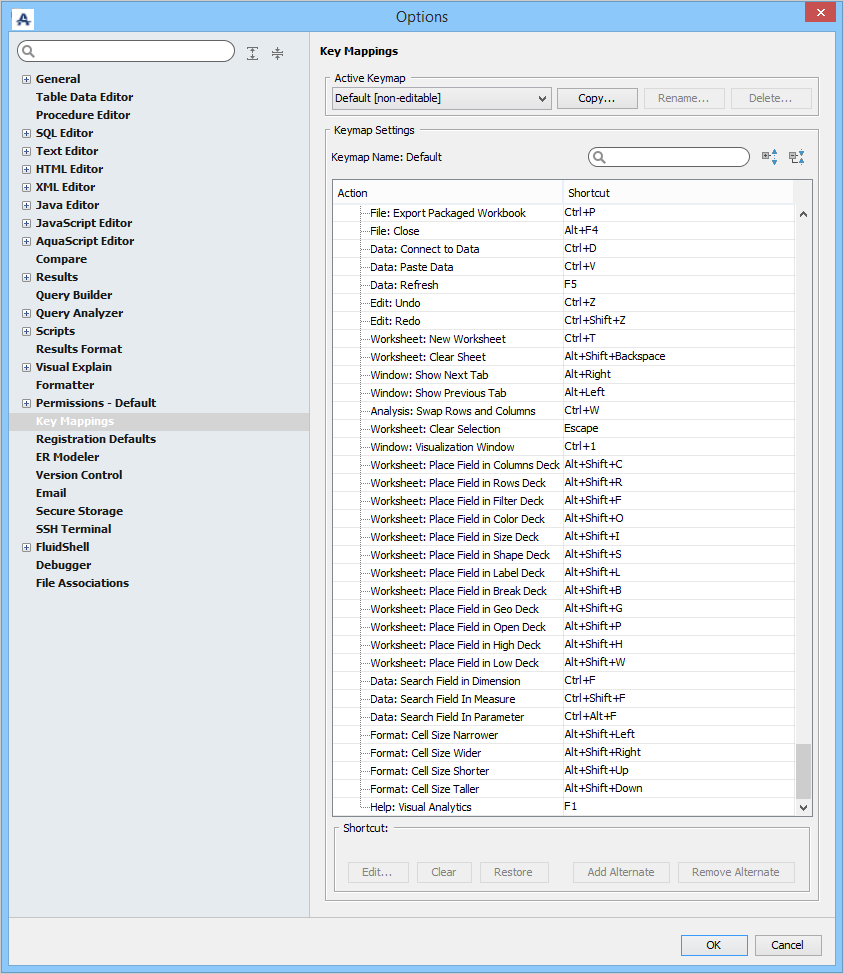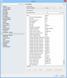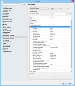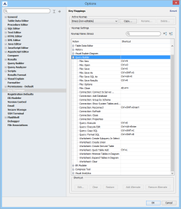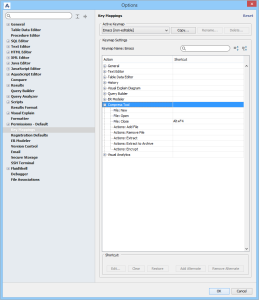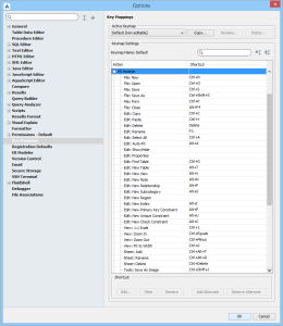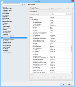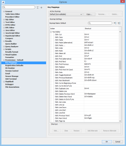 Key Mappings - The Key Mapping Options allows you to configure new key mapping profiles with new key bindings. This allows you to configure any keystroke to any action. The Key Mapping Options allow creating custom keymaps by copying existing keymaps, then configuring individual shortcut key bindings within a custom keymap.  All custom keymaps may be edited, renamed and deleted. It is possible to add alternate keybinding shortcuts within a custom keymap for the same action. There are two built-in keymaps which cannot be renamed, edited or deleted, but may be copied as the foundation for new custom keymaps: