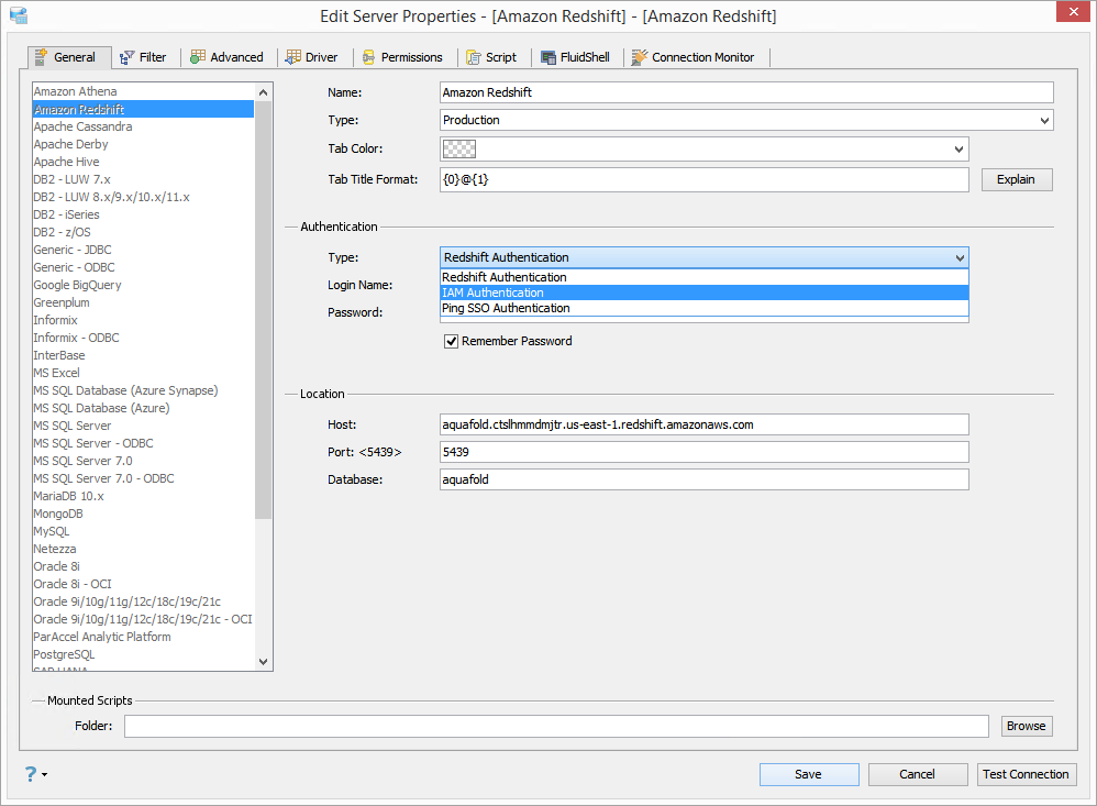 In Amazon Redshift you can choose to connect through either Redshift Authentication, IAM Authentication or Ping SSO Authentication. Click on the drop-down menu and choose the authentication method you prefer.