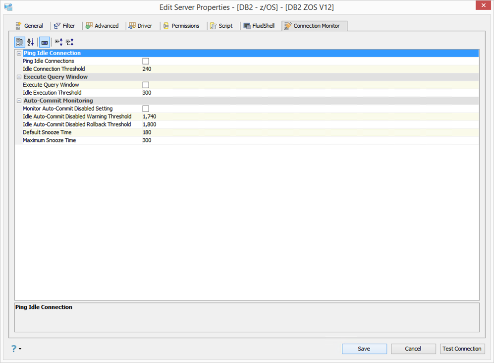 • Force Auto-Commit: When this option is selected, it sets auto-commit to TRUE for any Query Window to this server and disables the icons on the toolbar, regardless of the option in File > Options > Query Analyzer > [DATABASE] > [Auto Commit].