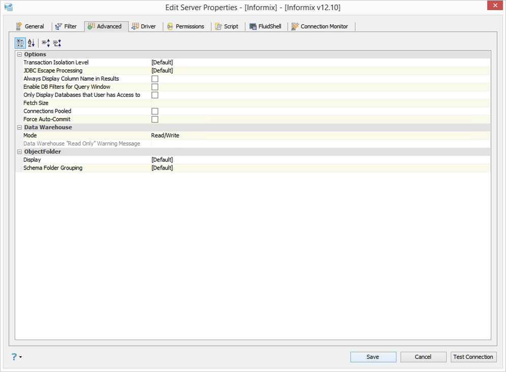 Edit the Server Properties to use Advanced Properties in Aqua Data Studio: