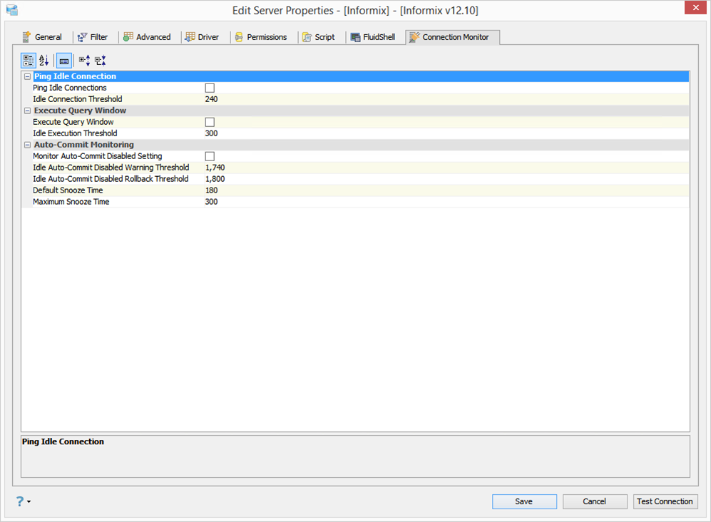 - Force Auto-Commit: When this option is selected, it sets auto-commit to TRUE for any Query Window to this server and disables the icons on the toolbar, regardless of the option in File > Options > Query Analyzer > [DATABASE] > [Auto Commit].