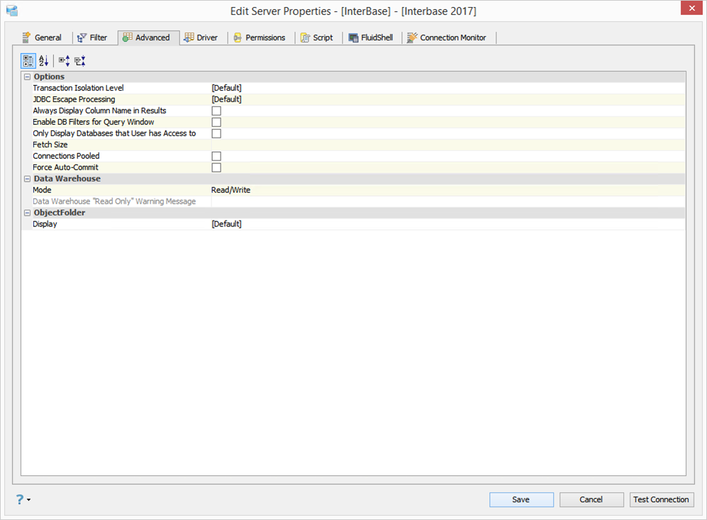 Edit the Server Properties to use Advanced Properties in Aqua Data Studio: