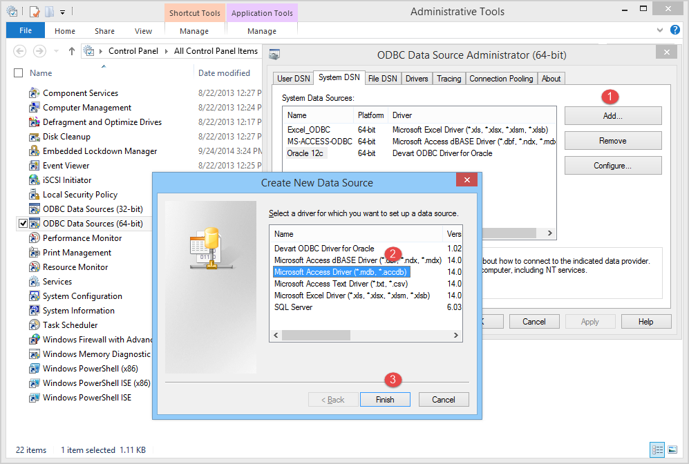 1. Within Windows, go to Start > Control Panel > Administrative Tools > Data Sources (ODBC) and right-click on Data Sources to Run as Administrator
