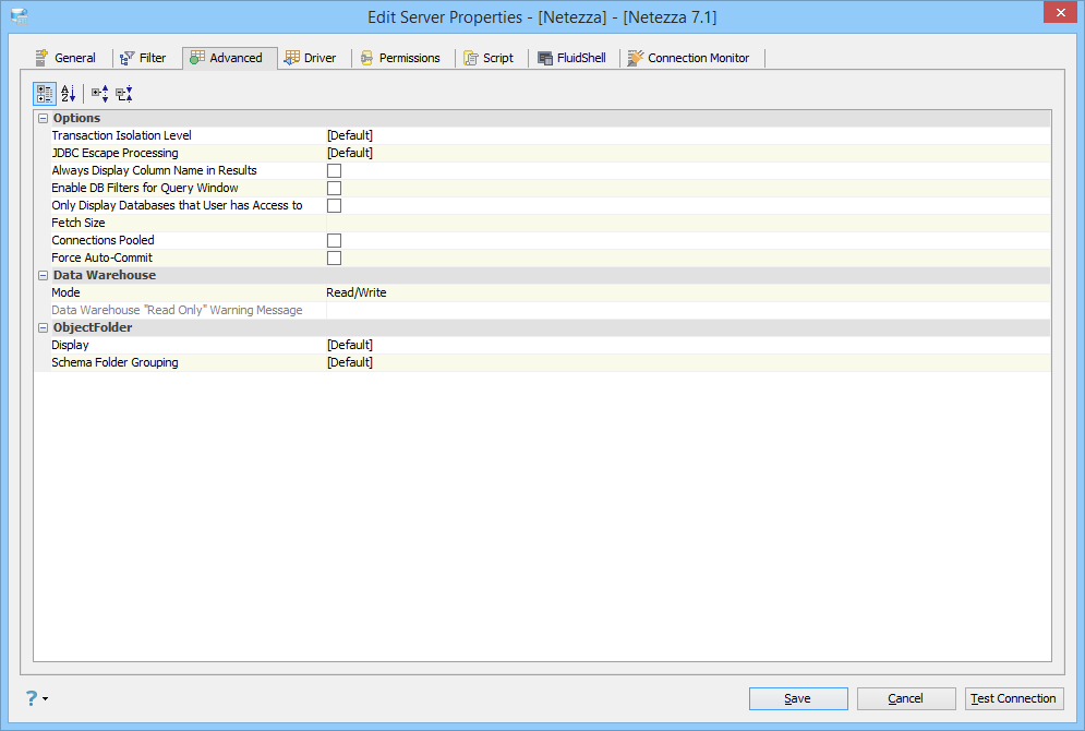 • Object Folder Schema Folder Grouping: Default, Yes or No. Schema Folder Grouping makes finding tables much easier because it groups them instead of showing each object individually.