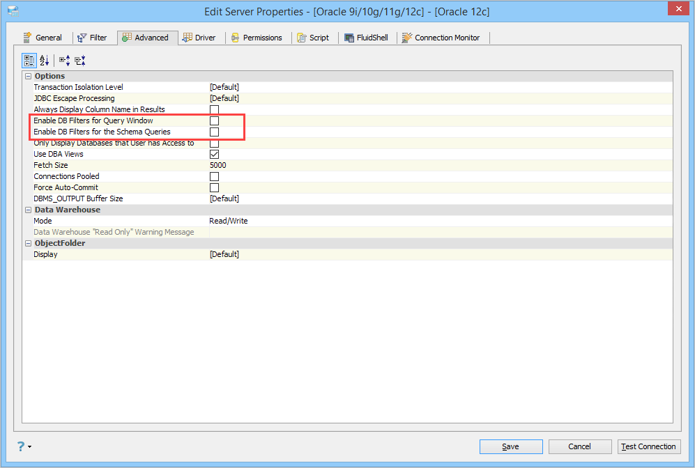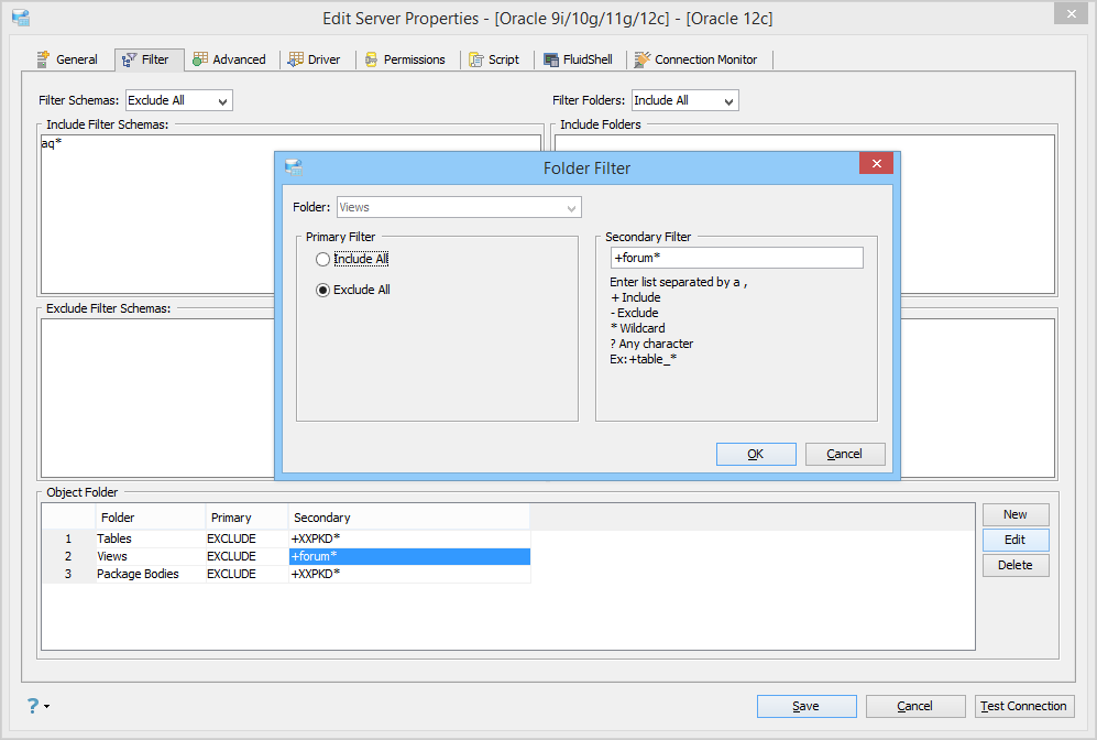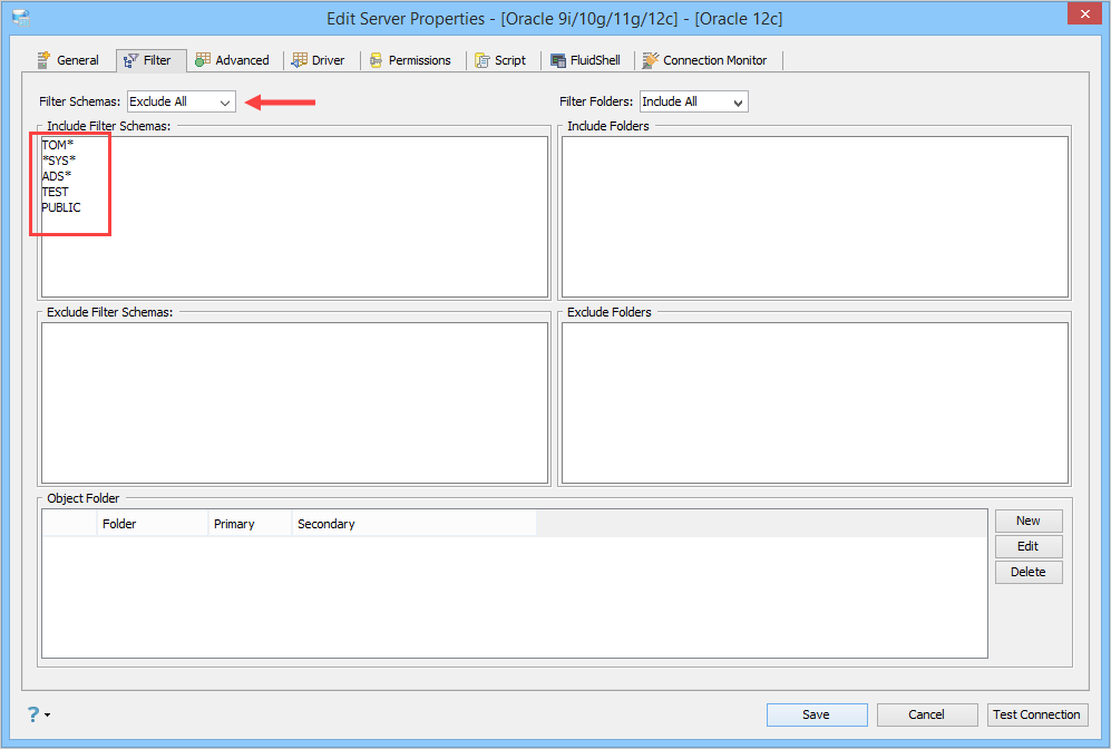- Object Folder filter works on individual folders inside a particular Schema. The user can define filters for each of the Tables, Views, etc. folders.